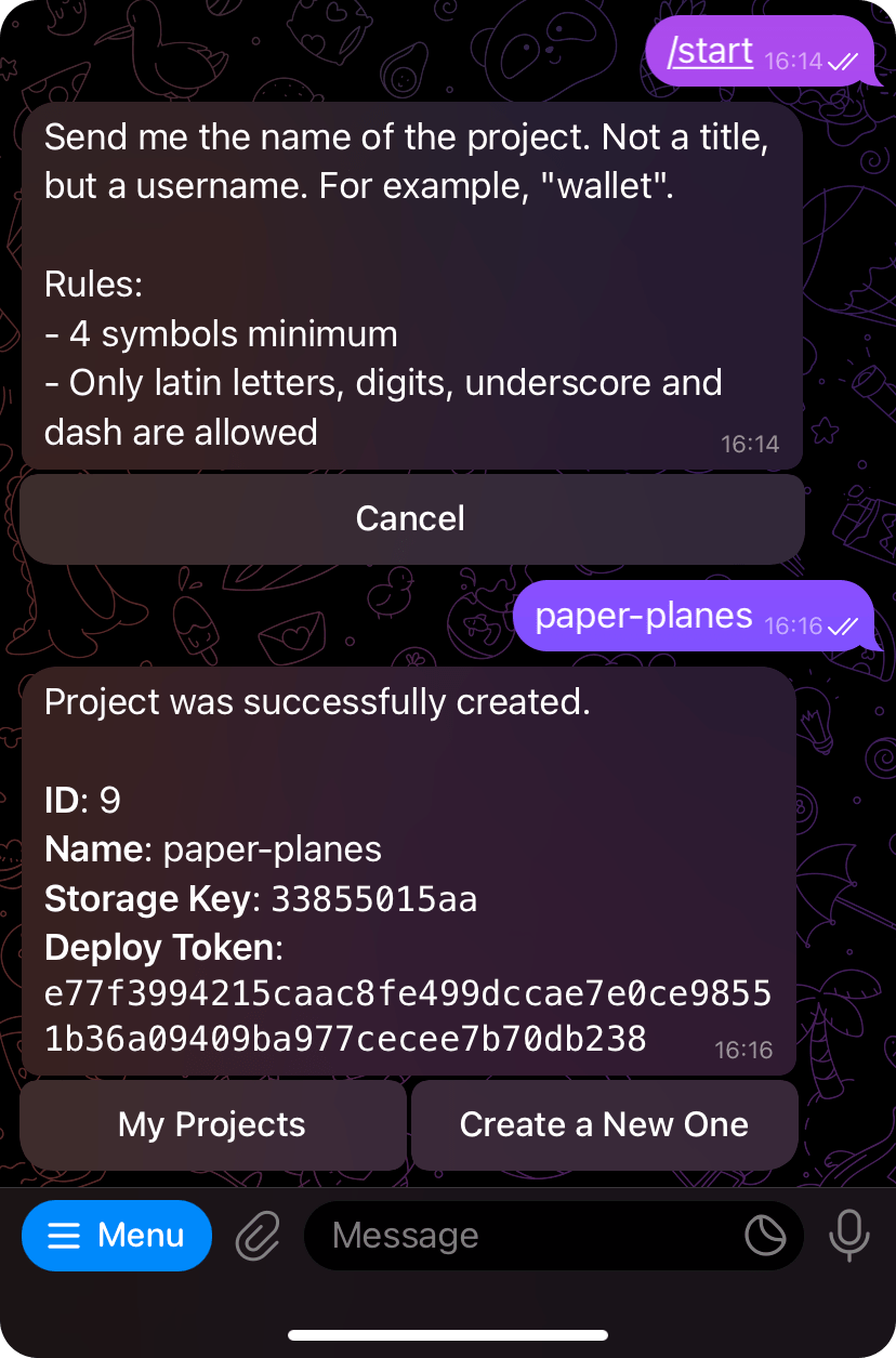 To start using the hosting functionality, you must register the project and obtain its deployment token. To get the token, go to@tma_mate_bot and press the Start button to